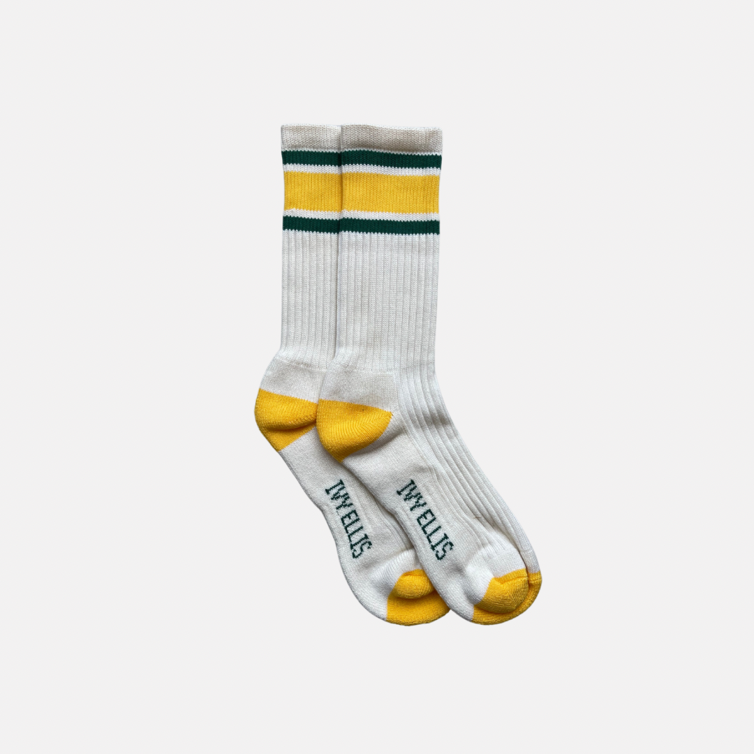The Starr socks from Ivy Ellis are named after Bart Starr, a Green Bay Packers legend. Made in Ivy Ellis vintage cream yarn with a yellow heel and toe.
