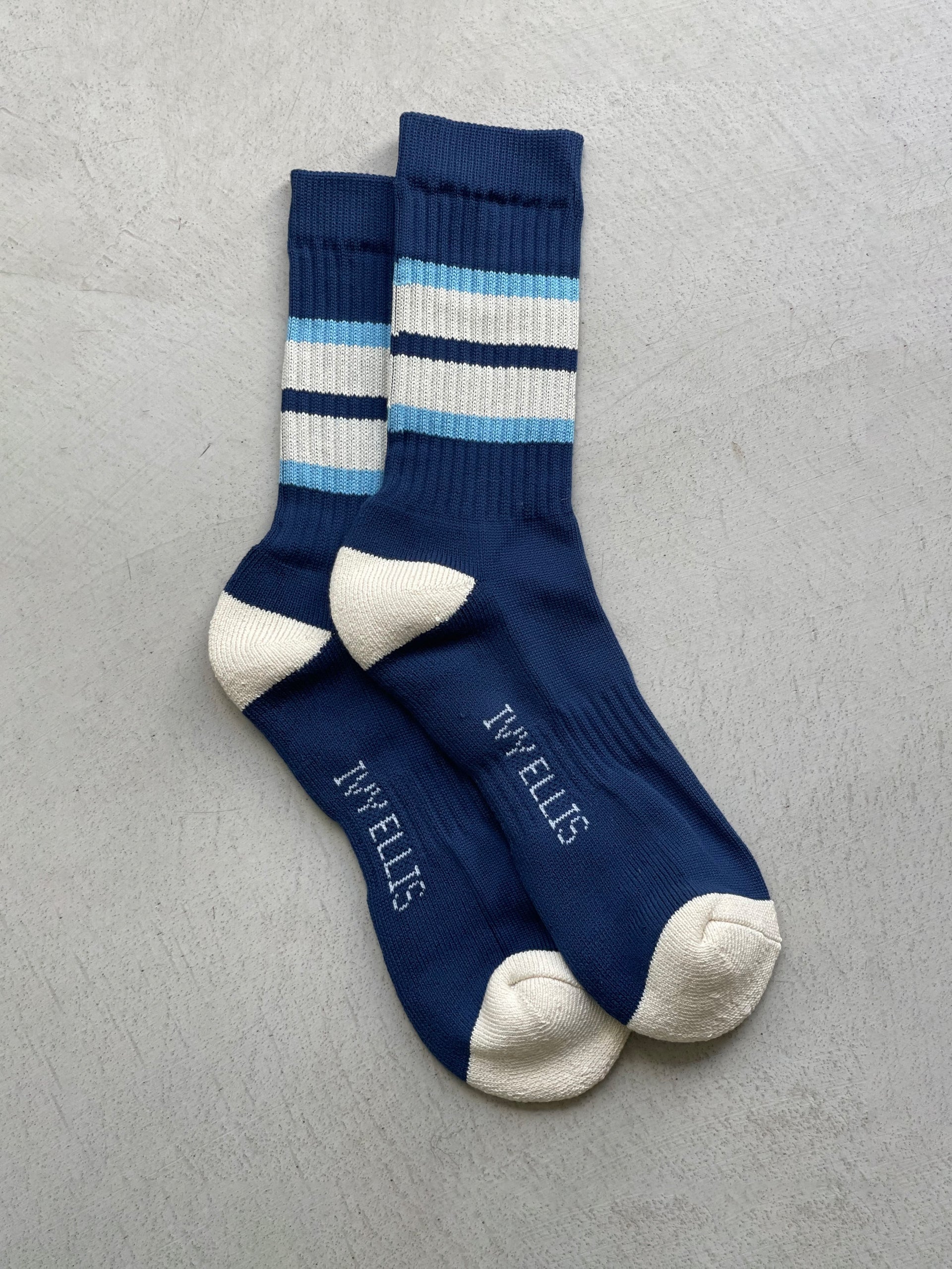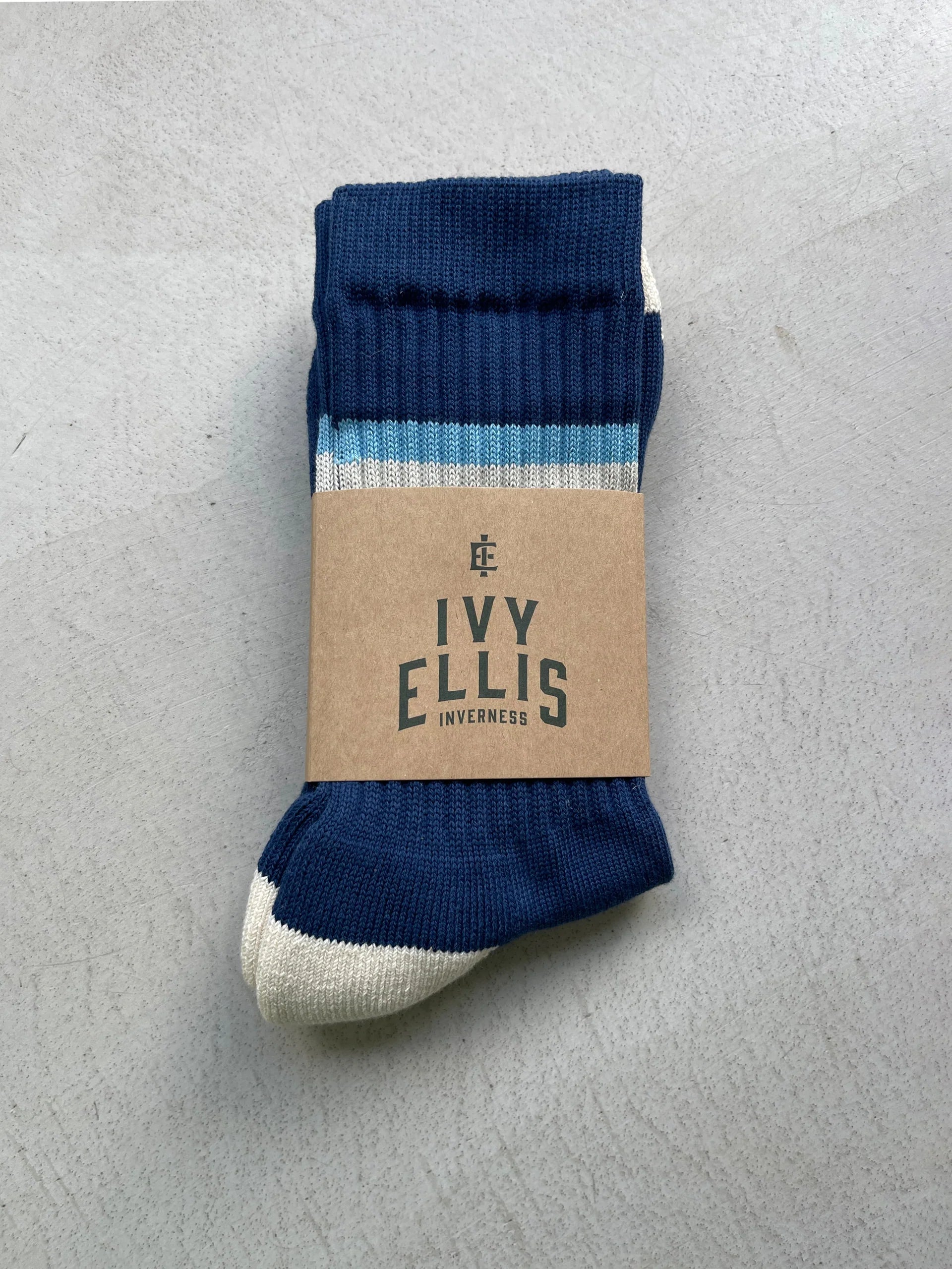 Crafted from premium ribbed cotton yarn, The Marvin features a deep navy base with a contrasting cream toe and heel, accented by striking light blue and cream stripes at the cuff. This timeless combination reflects the boldness and strength of the legendary fighter.